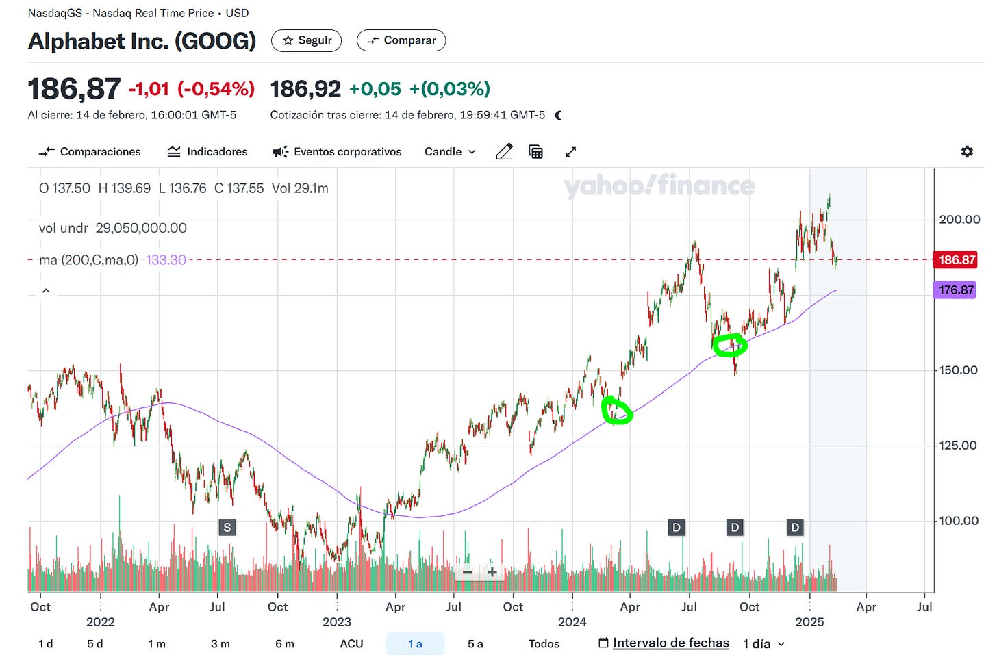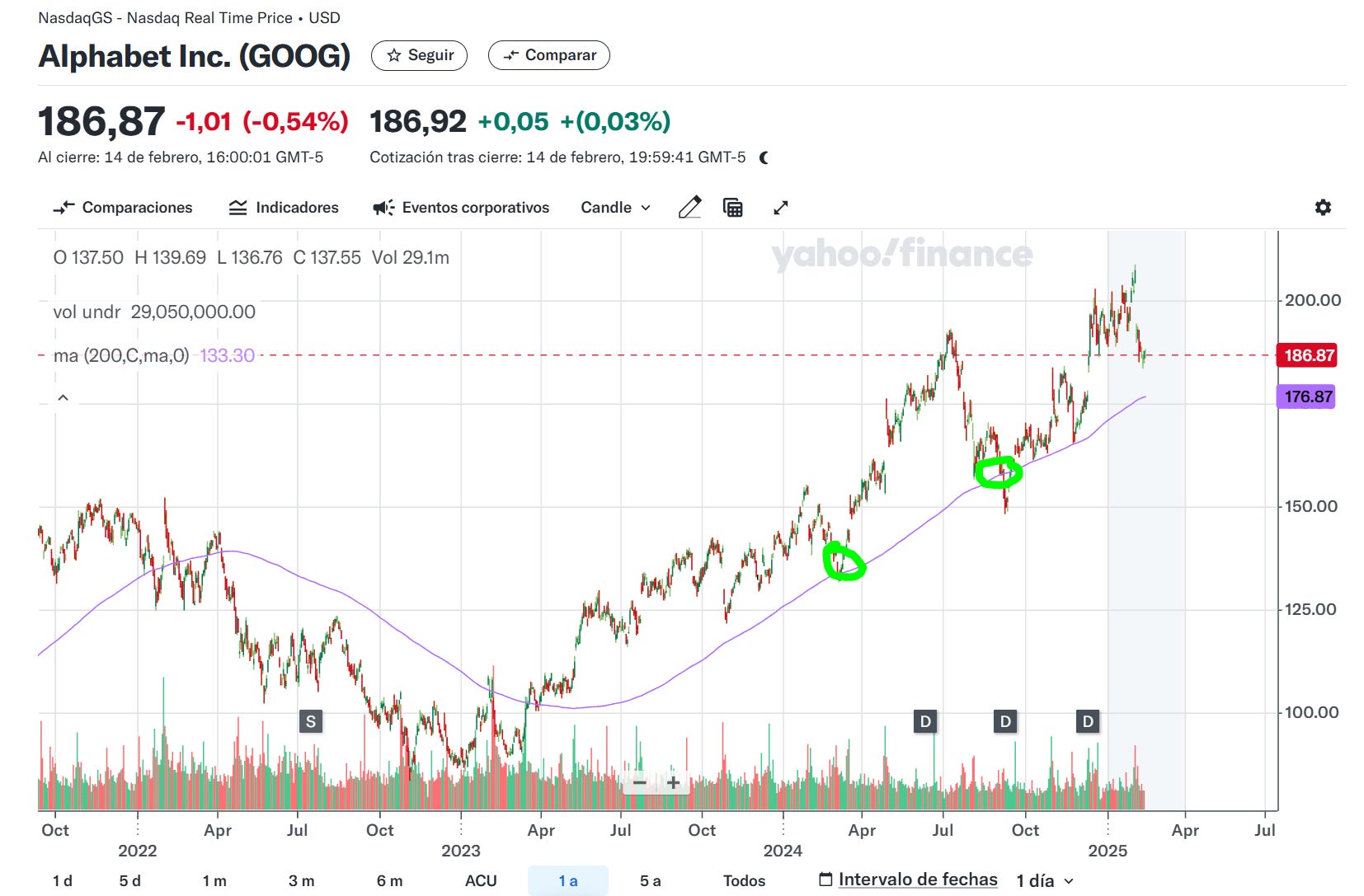 En azul tenéis la media móvil de 200 y el circulito verde marca las zonas en las que hice entrada en las dos operaciones con google que hice en 2024, que puedes consultar en movimientos.