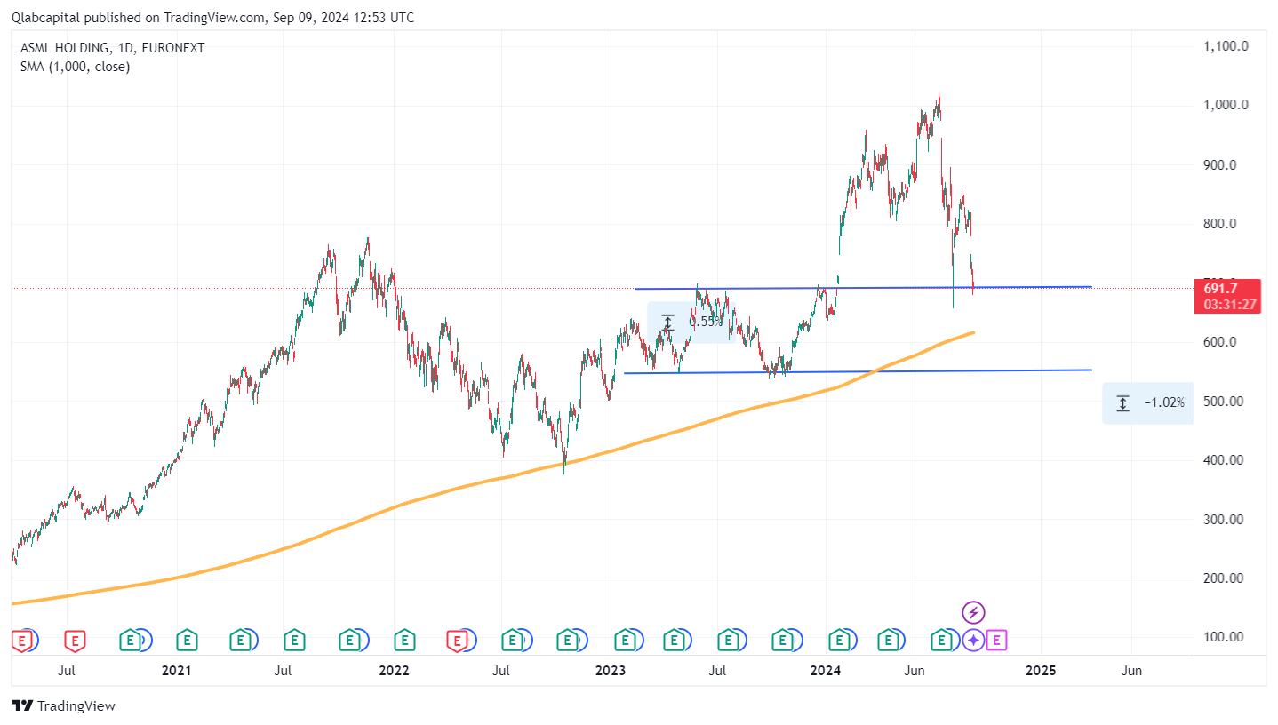 ASML es una de las empresas más grande de Europa y probablemente la más crítica y poderosa del viejo continente. Es la segunda vez que opero con ella. La última vez, en Diciembre, cerré la operación justamente en la zona en la que se encuentra ahora, con un un profit superior al 50%.