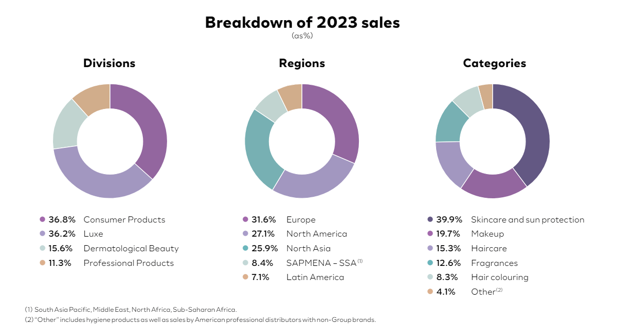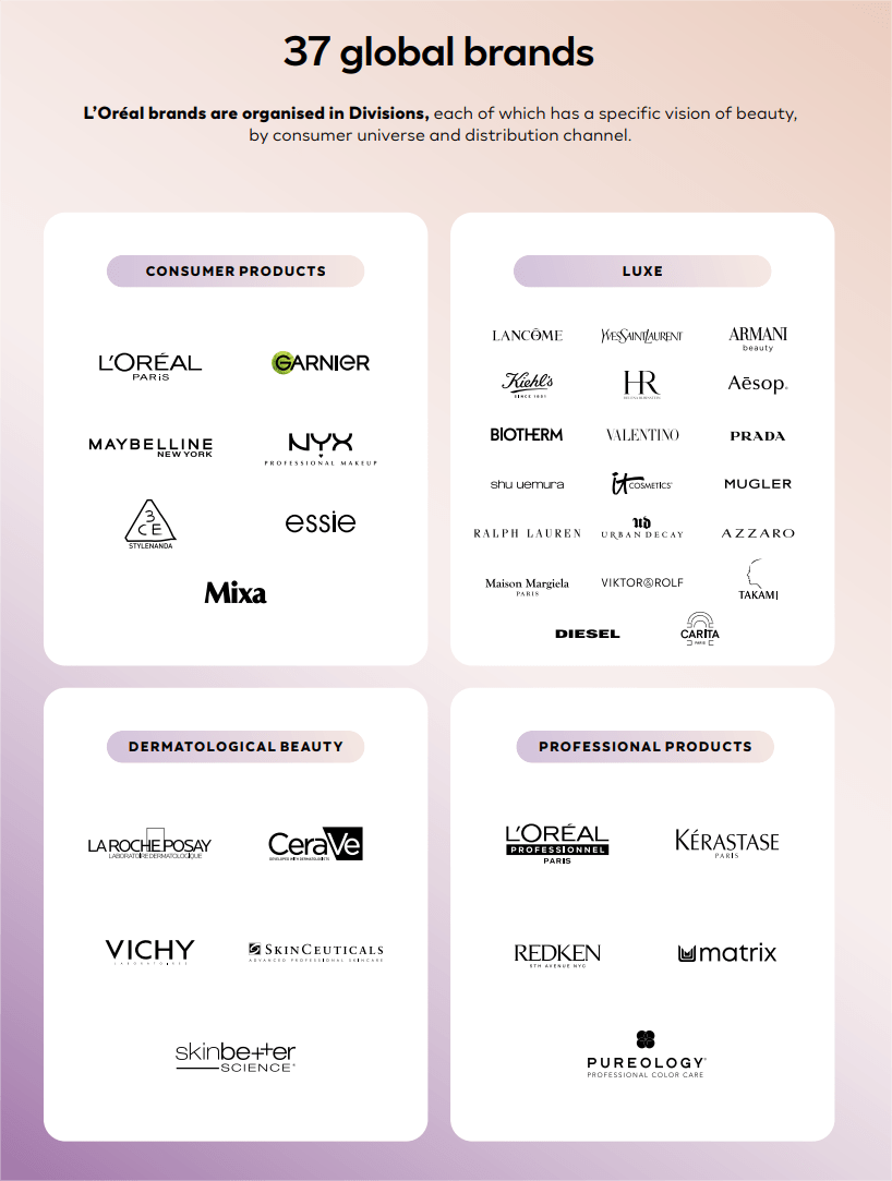 La empresa opera con 37 marcas globales divididas en 4 segmentos. El segmento de consumer products se enfoca en los productos de masas y el de lujo en las clases medias o medias altas en lo que entraría dentro del lujo aspiracional. Finalmente tenemos los segmentos de dermatología y productos profesionales.