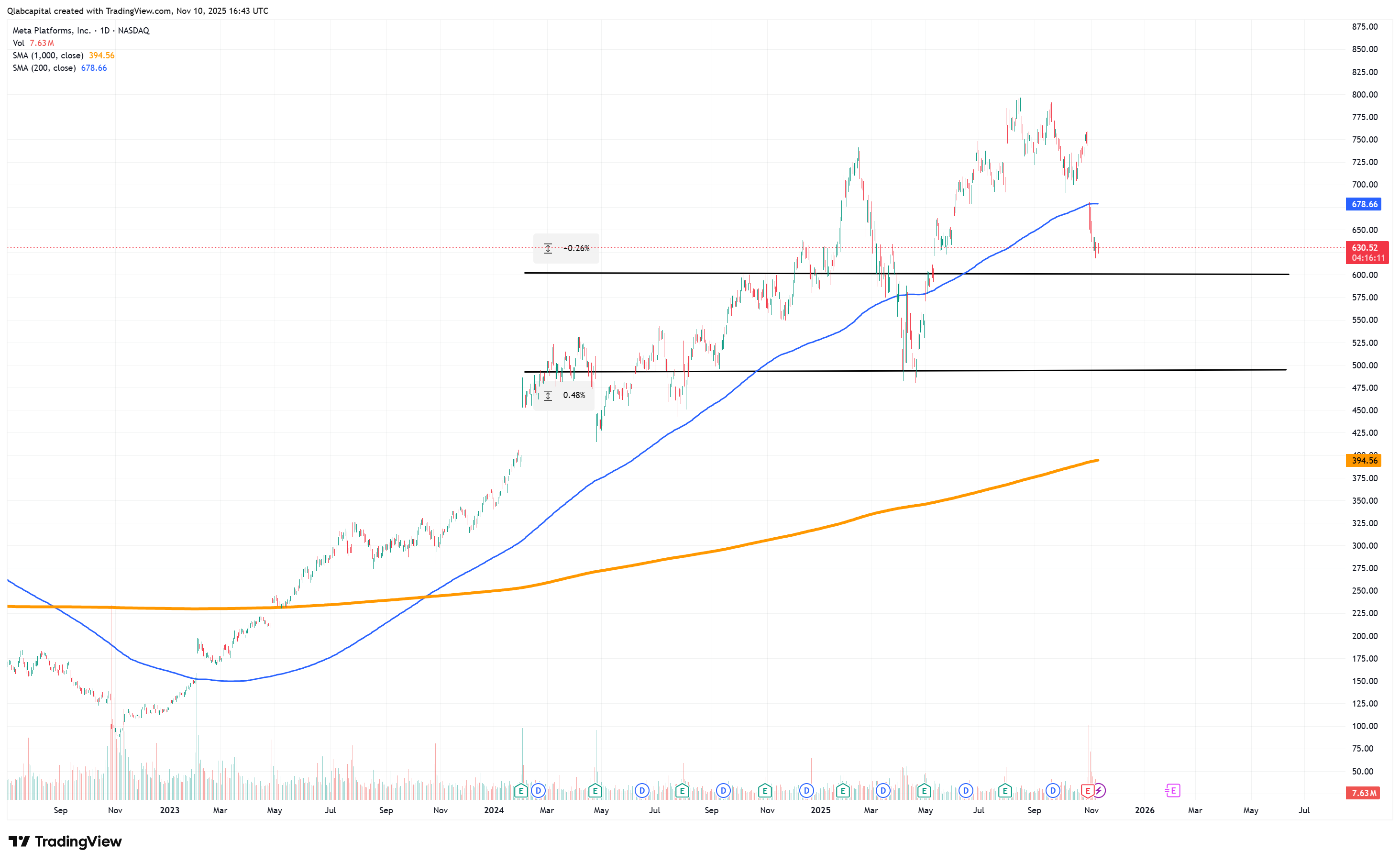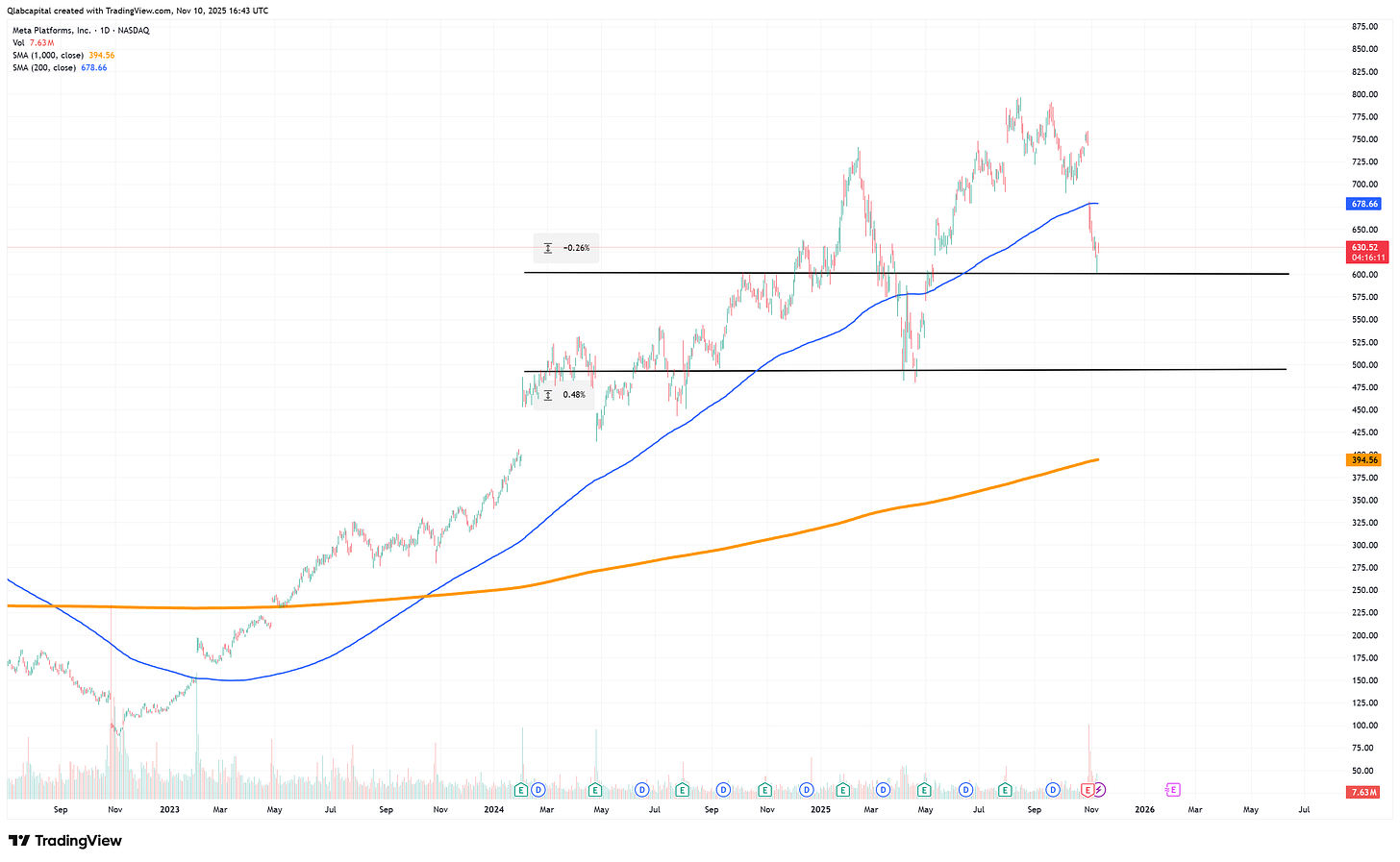 Resultado: la acción ha corregido con fuerza desde máximos históricos. No hablamos de una pequeña toma de beneficios, sino de un reset de expectativas: el mercado descuenta que los márgenes no van a ser tan bonitos como en 2024 y que el perfil de riesgo de capital allocation vuelve a subir. No hay tanta confianza en que los sueños de Zuckerberg no se acaben traduciendo en pérdidas millonarias.
