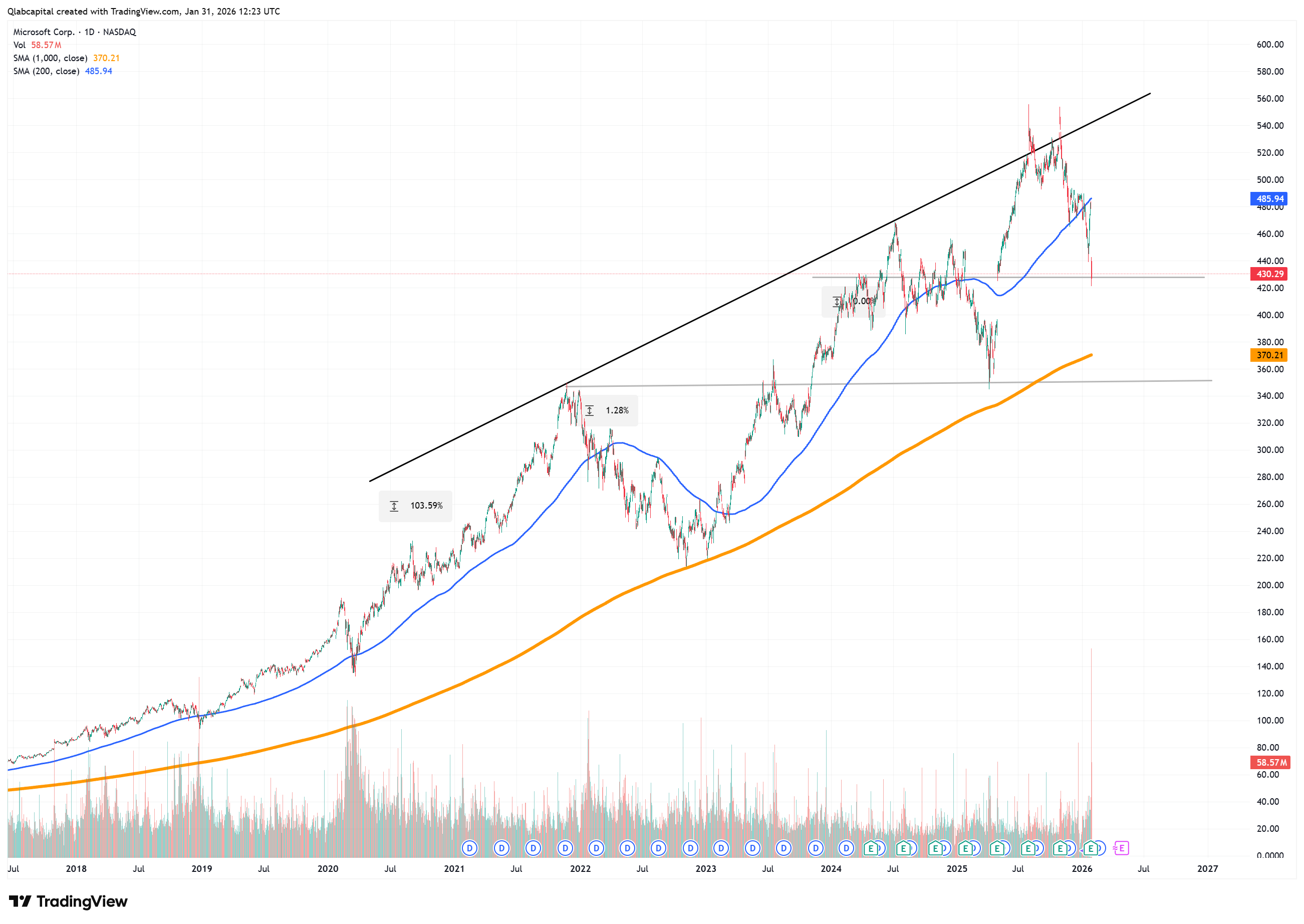 En este post voy a hablar de Microsoft (MSFT): por qué creo que la caída tras los resultados es una clara oportunidad de compra y cómo debemos aprovechar estos momentos de debilidad para posicionarnos. Es exactamente la misma estrategia que seguimos con META: rotar capital desde compañías que ya han recuperado, nos han dado beneficios y tienen un potencial más limitado (como ha sido el caso de ASML) hacia los siguientes infravalorados momentáneamente.