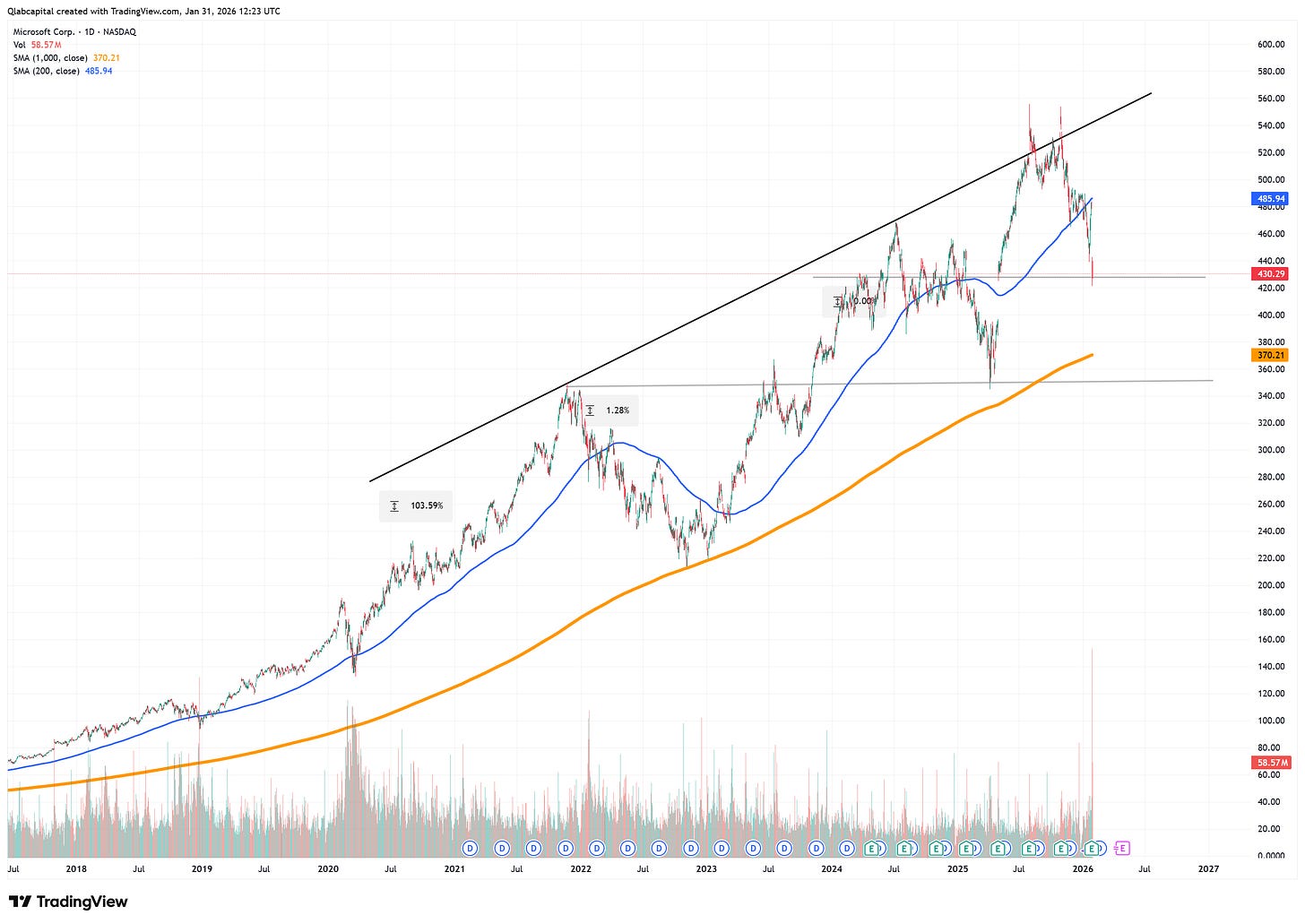 La acción ha registrado la segunda mayor caída de su historia... tras presentar unos resultados estelares. La narrativa bajista se centra en que “Azure ha crecido un poco menos de lo esperado” o que “el aumento de Capex es mastodóntico”.