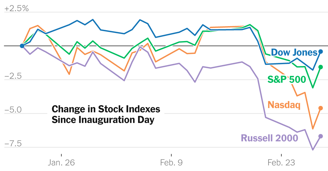 Este gráfico del New York Times muestra la evolución de los principales índices desde el inicio de la nueva administración Trump.