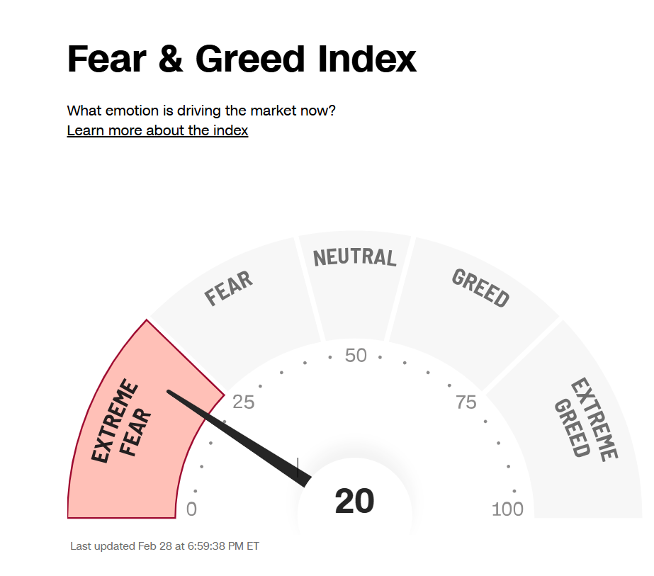 Febrero no ha sido un buen mes para los mercados, especialmente para el mercado americano. Sin embargo, voy a comentar como, a diferencia de la caída de agosto, estamos todavía bastante lejos de un pánico extremo, a pesar de lo que podemos ver en el famoso indicador Fear and Greed que encabeza este post.