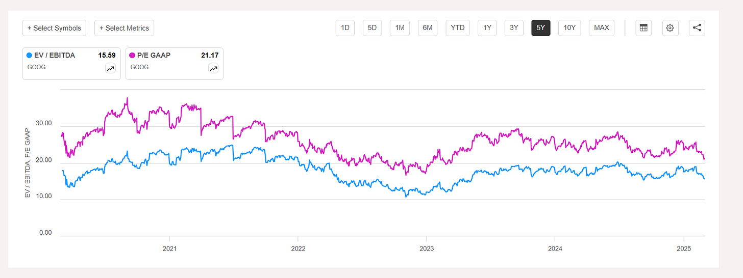 Google merece una mención aparte. La tenemos ahora a PER 2025 de 19. Si tenemos cuenta EV/EBITDA o PE actuales, no veíamos esta valoración desde el crash tecnológico de 2022.