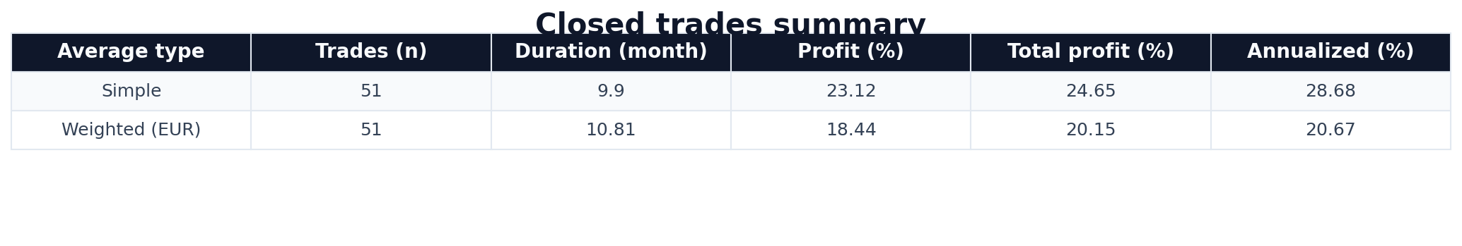 Finalmente, aquí podemos ver el resumen de todas las operaciones cerradas, tanto la media simple como la promediada con el peso de la operación. También está el retorno equivalente a 12 meses (annualized):