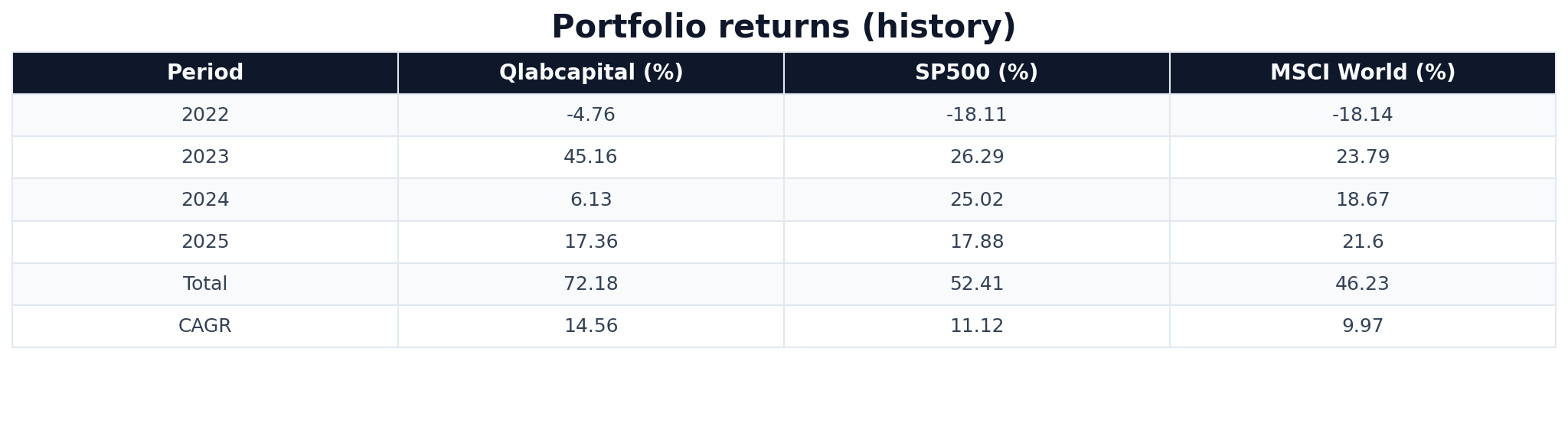 Aquí están las rentabilidades anuales comparadas con los índices de referencia S&P500 y MSCI World, así como la rentabilidad total acumulada en el periodo y el CAGR (Compound Anual Growth Rate).