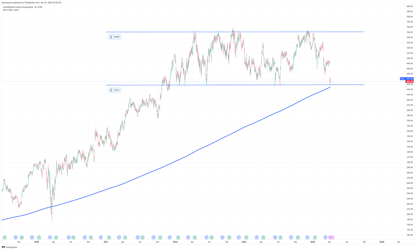 Como podemos ver, la empresa sigue respetando la banda lateral en la que lleva varios años de entre 550$ y 450$ que es donde se ha parado ahora y que es la zona buena de compra. Pero es ahora, debido a todos estos problemas, cuando además se acerca a la media móvil de 1000 sesiones, a la que no se acerca nunca salvo por un crash de mercado global.